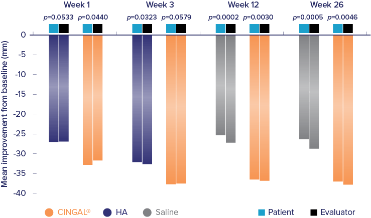 Cingal® delivered a 59% (-34.6 mm) and 68% (-40.1 mm) improvement relative to baseline at Weeks 1 and 3, respectively (ITT population; secondary endpoint).